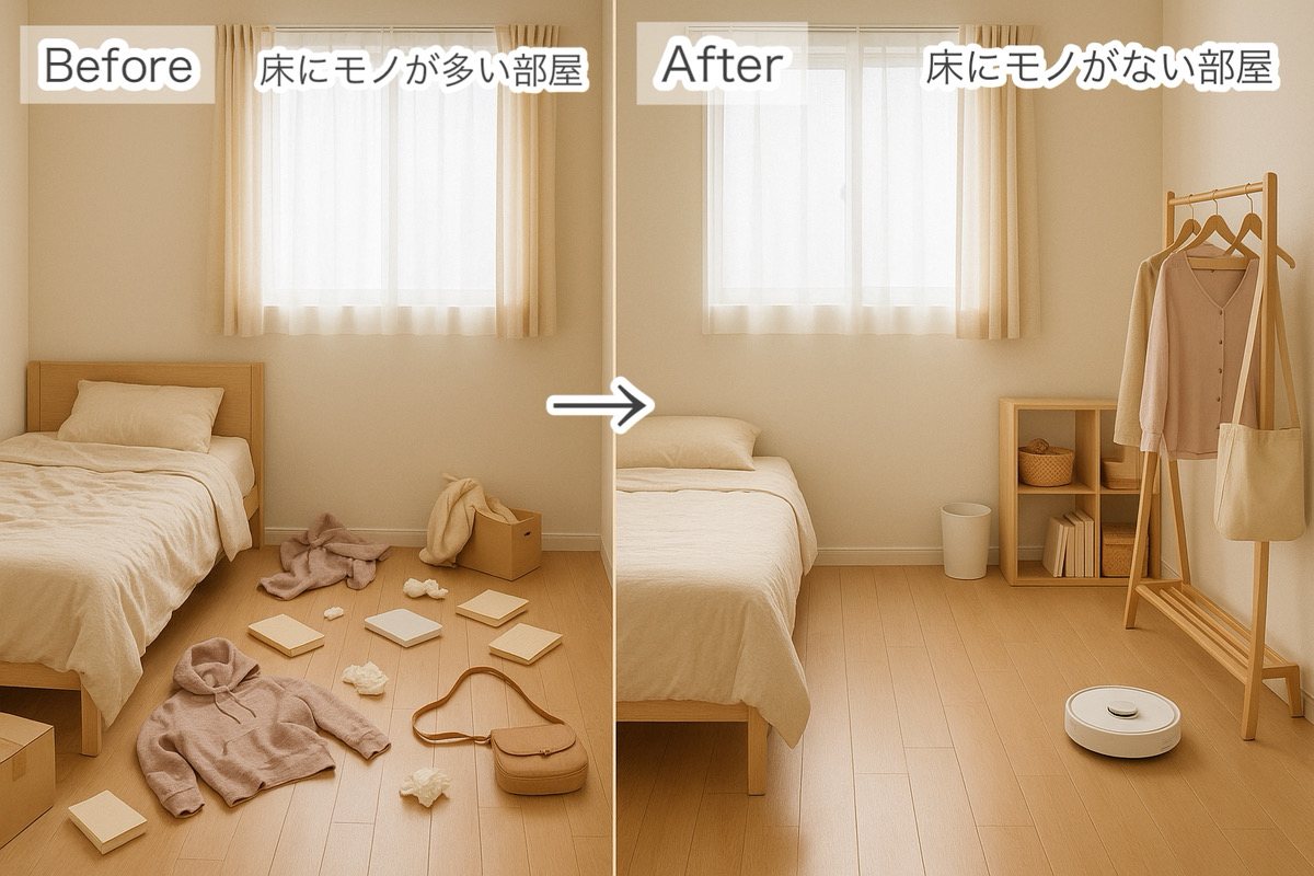 また、ロボット掃除機を使いはじめると、「床にモノを置かないようにしよう」という意識が自然と芽生えます。なぜなら、床にものがあっては、物理的にロボット掃除機が稼働できないからです。